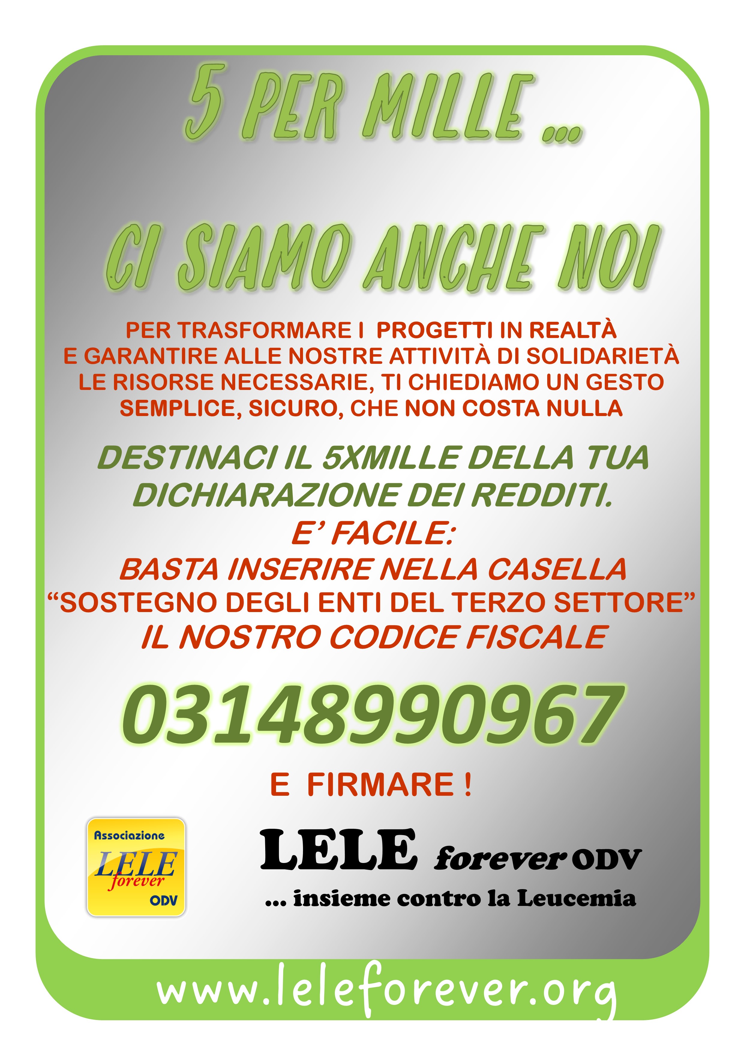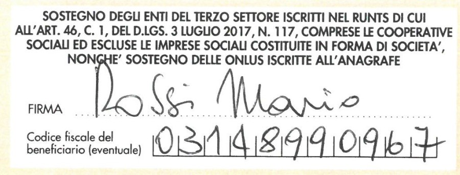 Destinaci il 5xmille della tua dichiarazione dei redditi. E’ facile: basta inserire nella casella “SOSTEGNO DEGLI ENTI DEL TERZO SETTORE”
