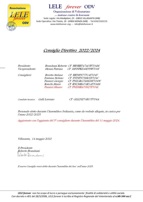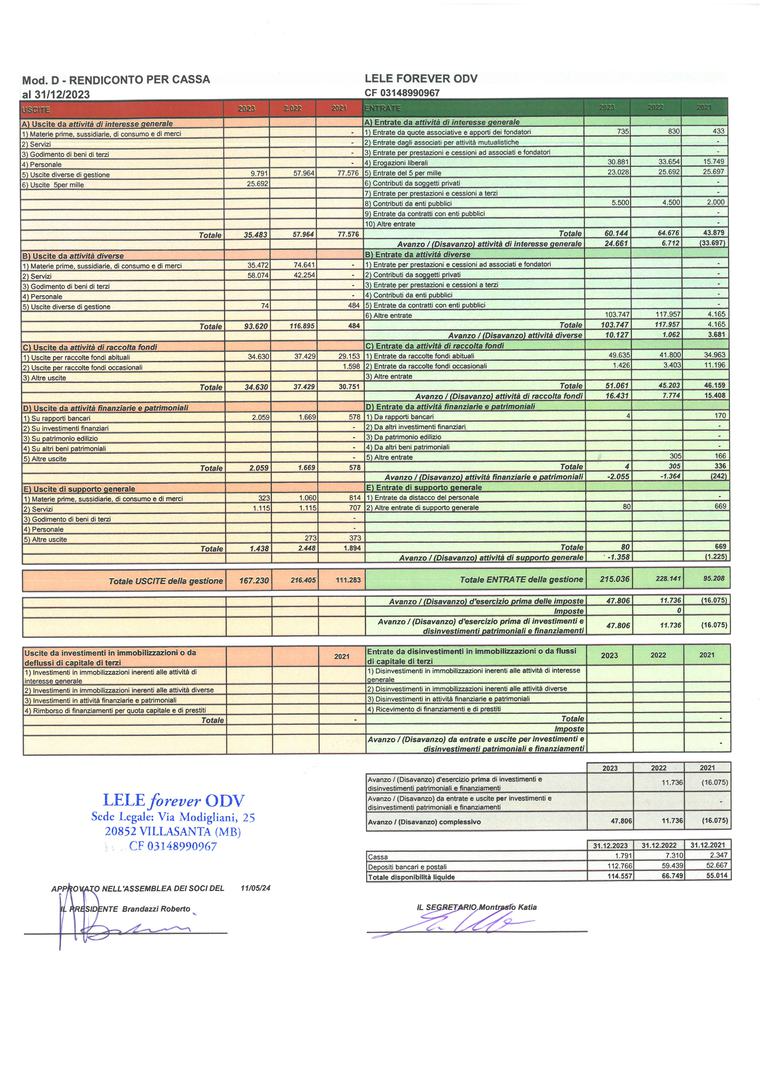 Per garantire la massima trasparenza sull'andamento della Associazione LELE FOREVER ODV, pubblichiamo il rendiconto per cassa del 2023, approvato dalla Assemblea dei Soci del 11 maggio 2024